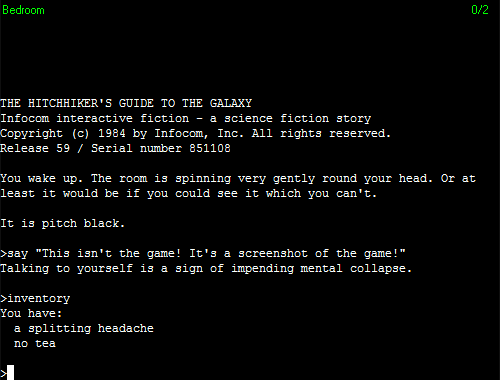 Text adventures were epitomised by the glorious era of Infocom, wherein games such as Bureaucracy, The Hitchhikers Guide To The Galaxy, Leather Goddesses Of Phobos and Zork were considered sophisticated, absorbing, complex and bloody difficult (hint: don’t neglect the small dog in HHGTTG).