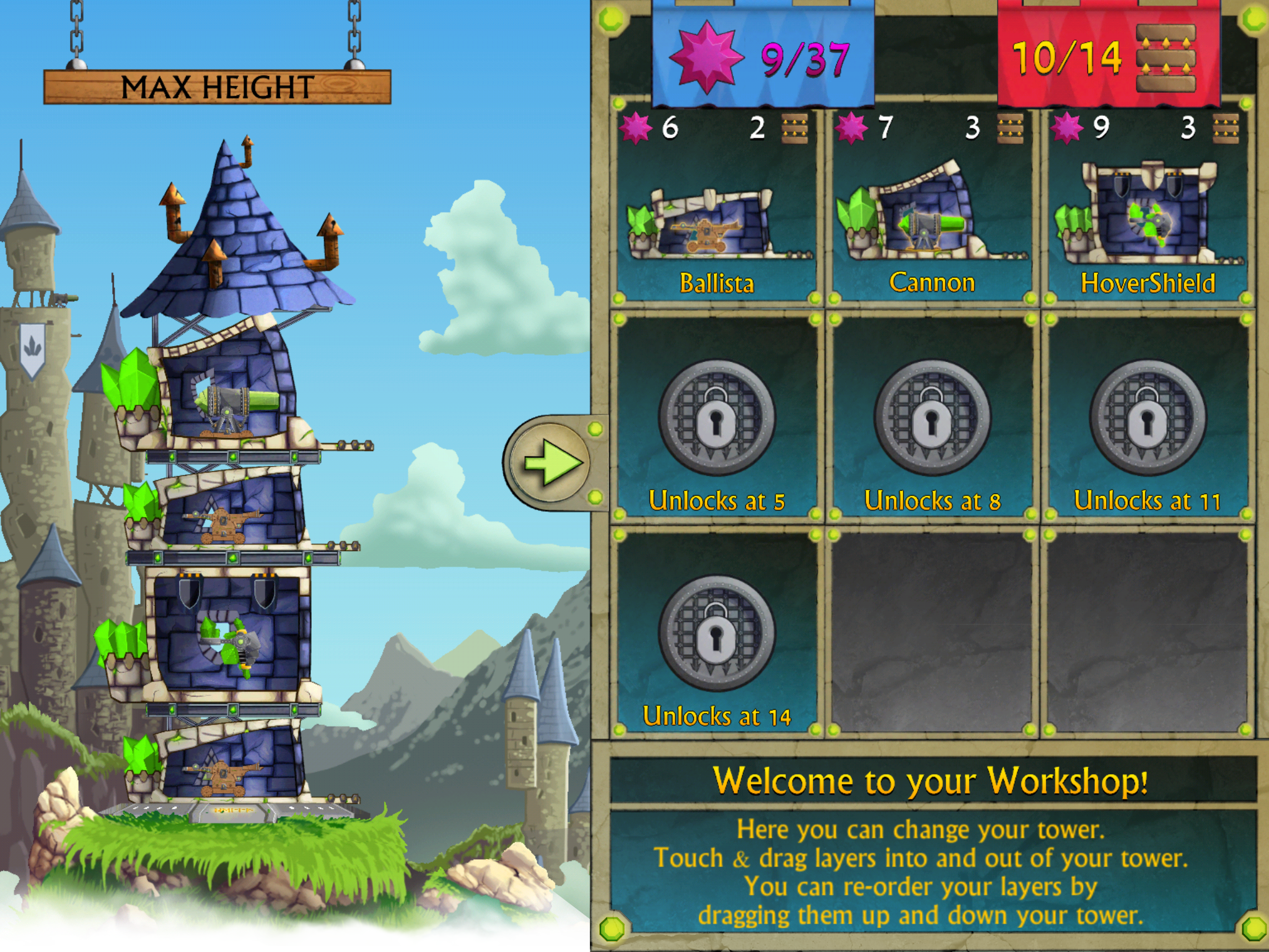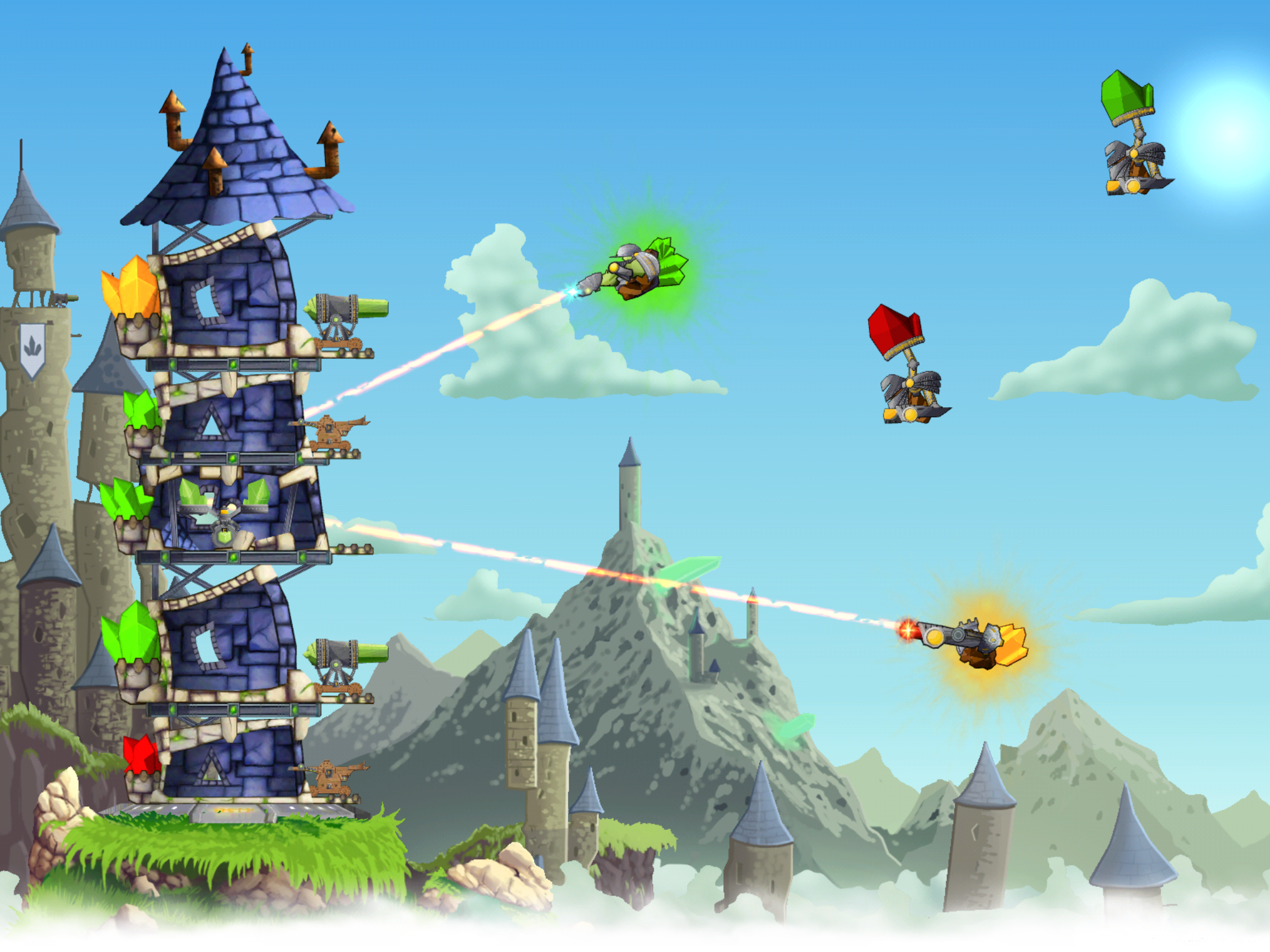 Players must build their tower using different offensive and defensive layers to help survive and destroy swarms of attacking robots. Weapons and defences must be balanced to maintain the tower’s stability and at the same time, lay waste to the fiendish magically-powered robots, killer bosses and earn enough points to unlock bigger, more powerful components for even deadlier and well-defended towers.